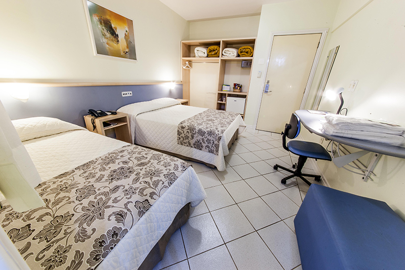 Seus apartamentos retratam limpeza no piso cerâmico, conforto e tranqüilidade nas camas tipo box-spring.
